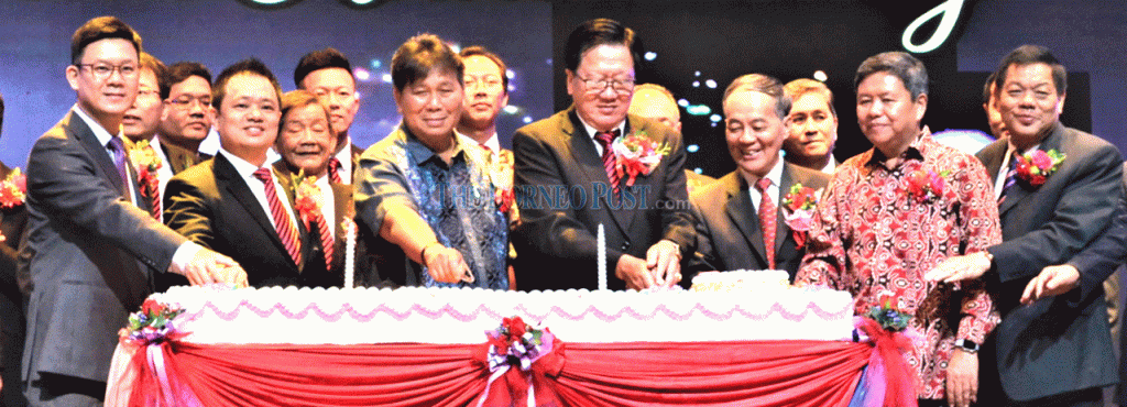 Malcolm (front, third left) and SSA president Ngieng Ping Sing on his left jointly lead the cake-cutting ceremony. Also seen are Sibu MP Oscar Ling (left) and Sibu Resident Charles Siaw (second right).